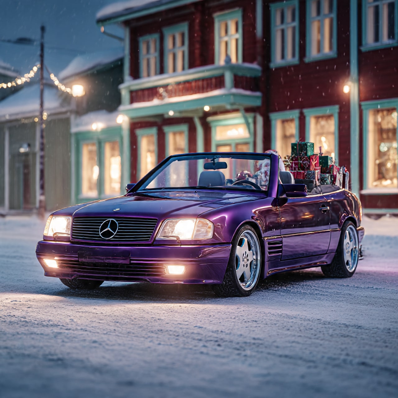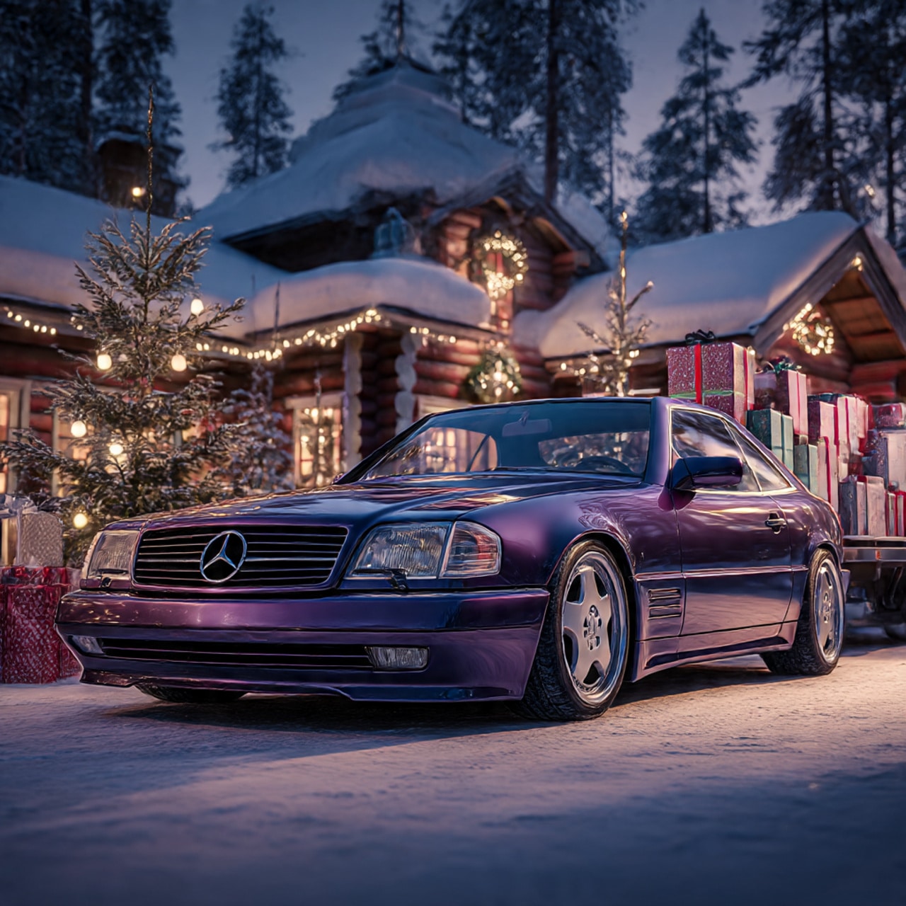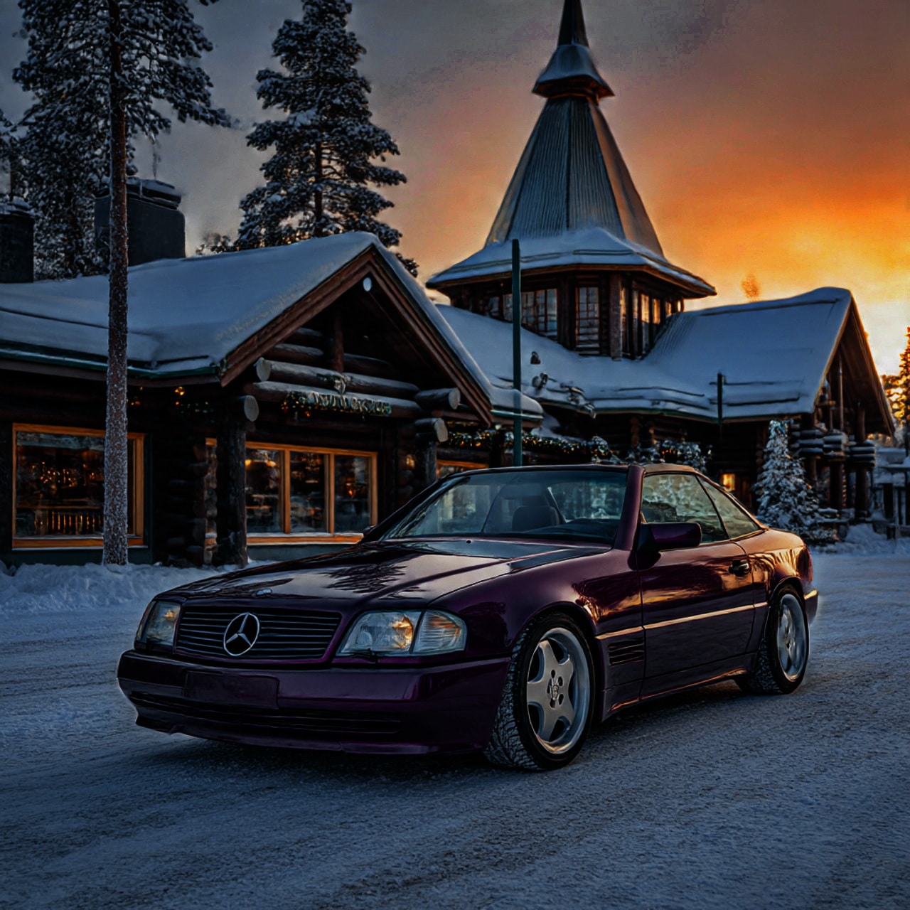 derweilen ein paar KI generierte SL Fotos , mit der Vorlages meines R129 vor dem Weihnachtsmannhaus in Rovaniemi ,)