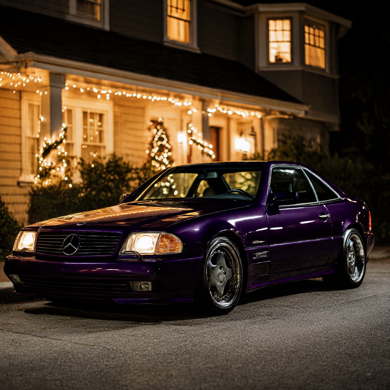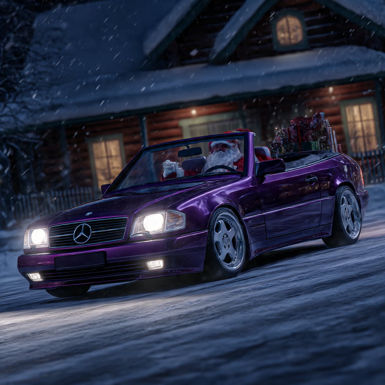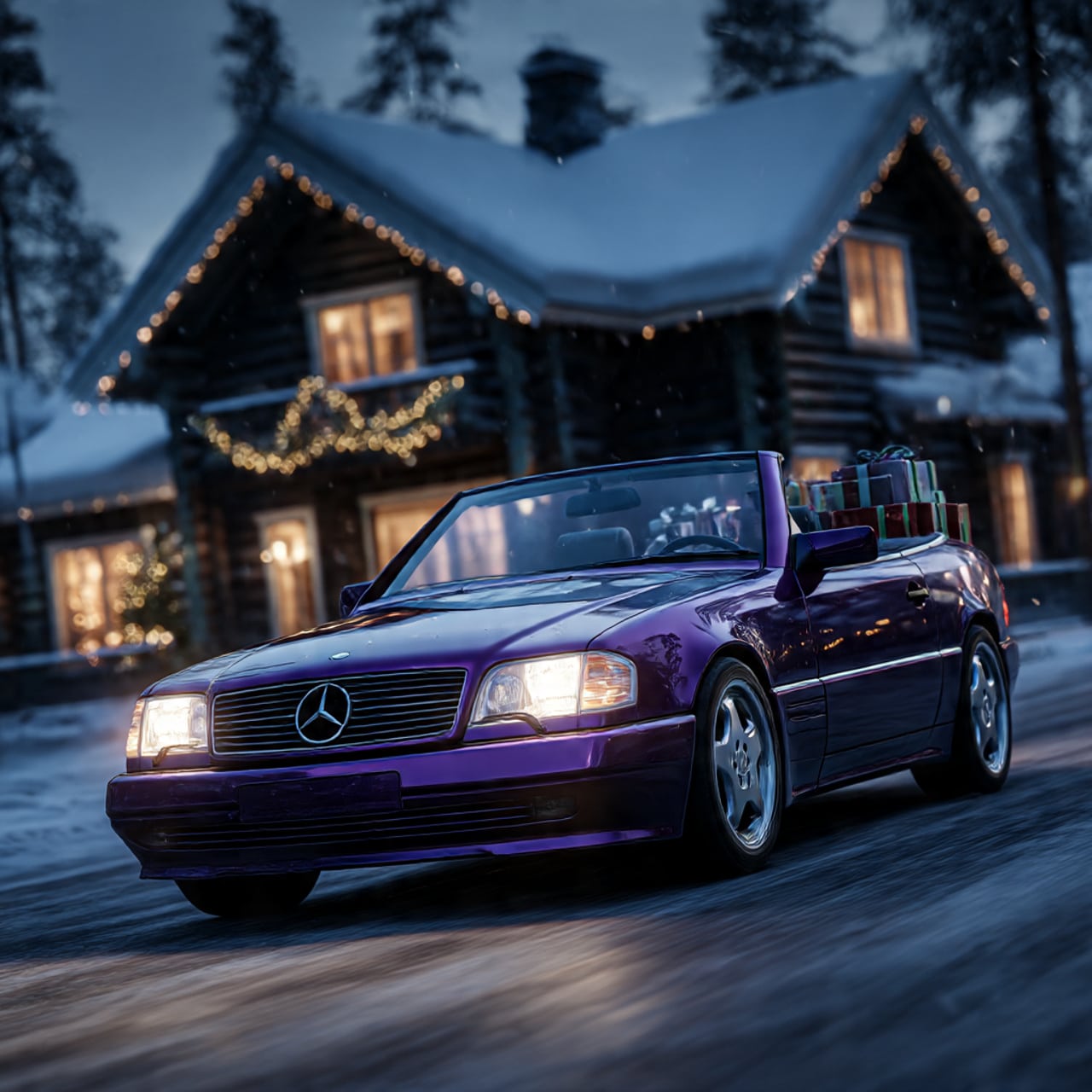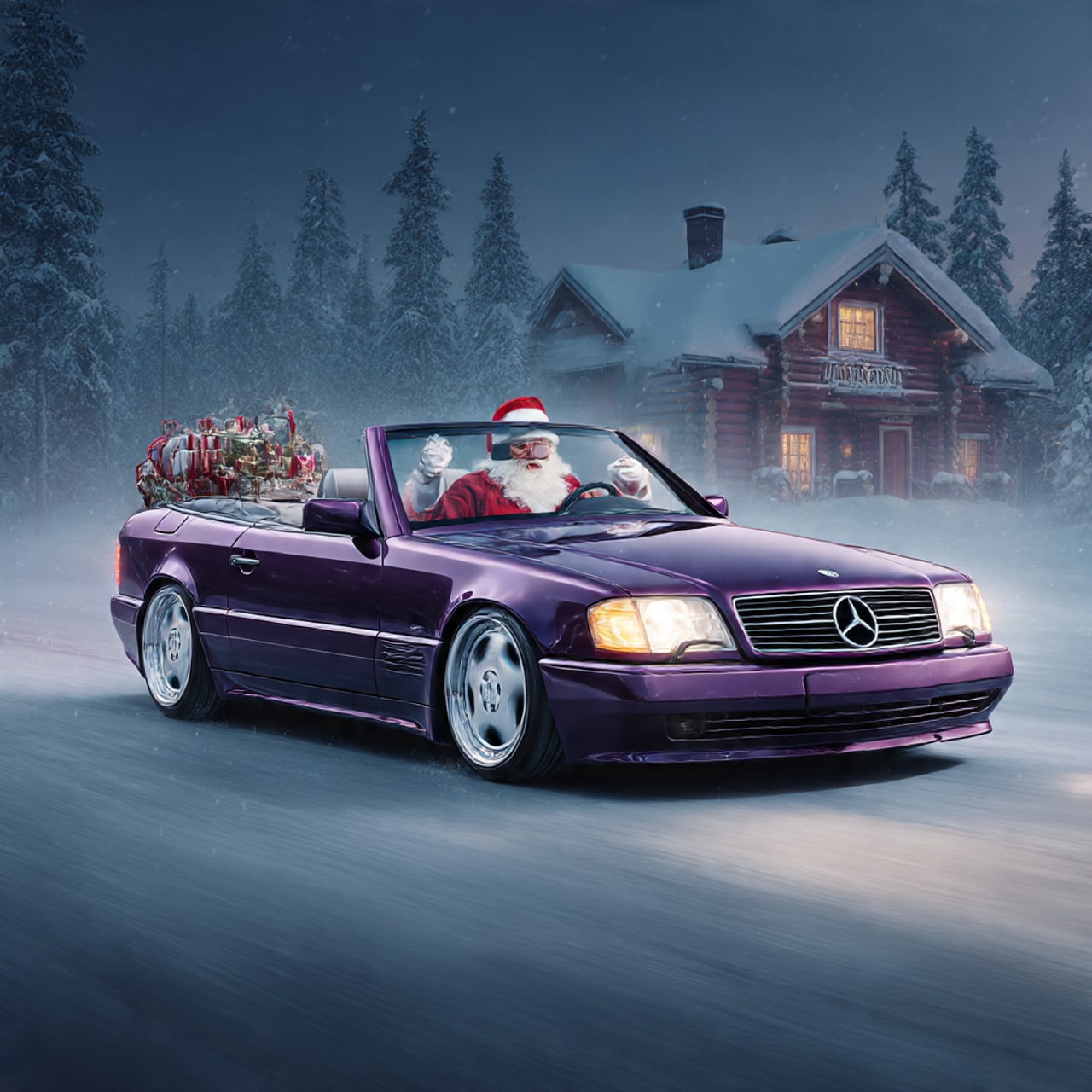 derweilen ein paar KI generierte SL Fotos , mit der Vorlages meines R129 vor dem Weihnachtsmannhaus in Rovaniemi ,)